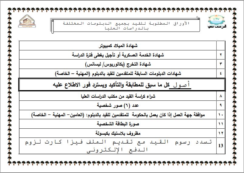 الأوراق المطلوبة للقيد بالدراسات العليا ⇐ الأوراق المطلوبة للقيد بجمع الدبلومات المختلفة بالدراسات العليا :_