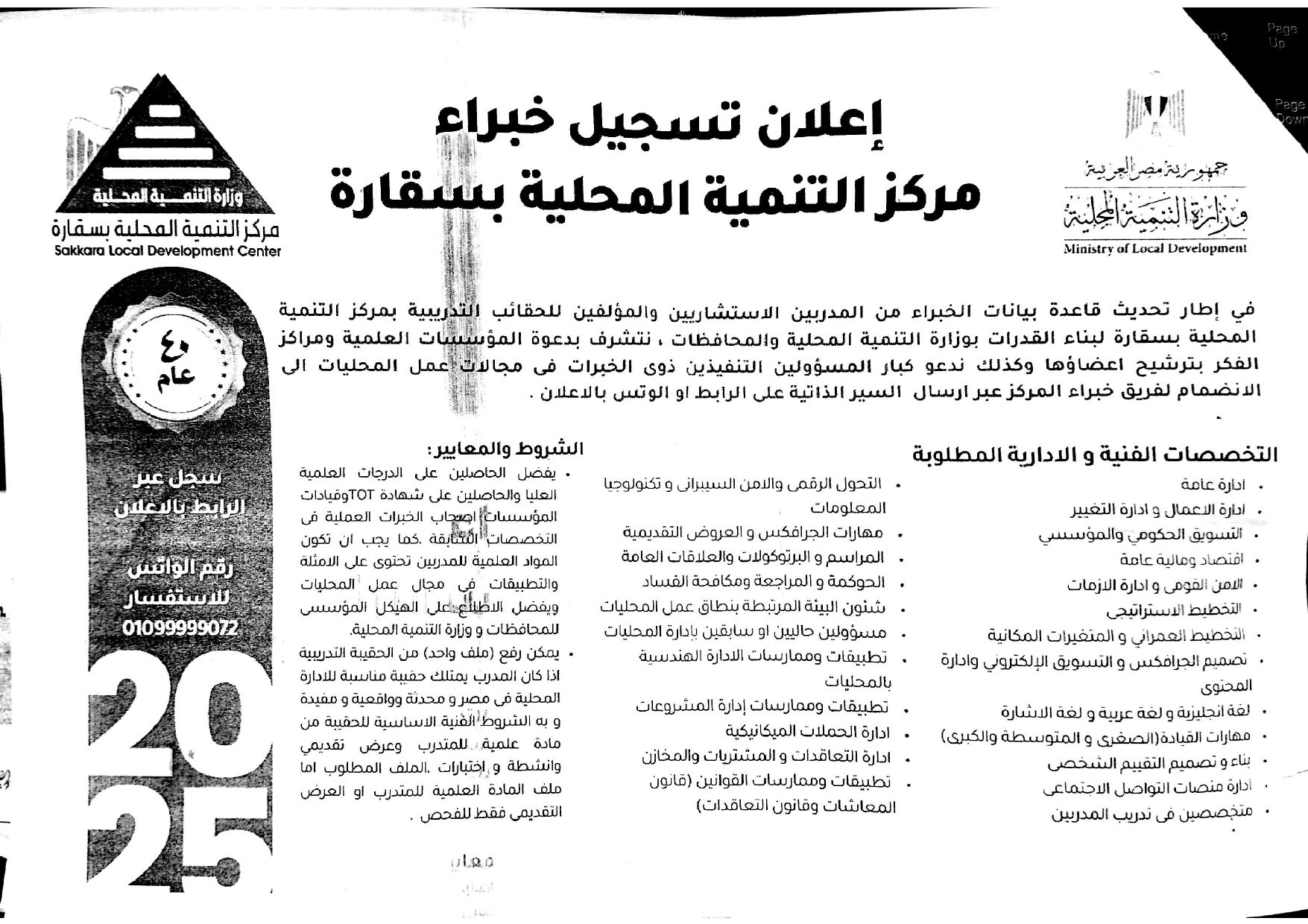 إعلان تسجيل خبراء مركز التنمية المحلية بسقارة