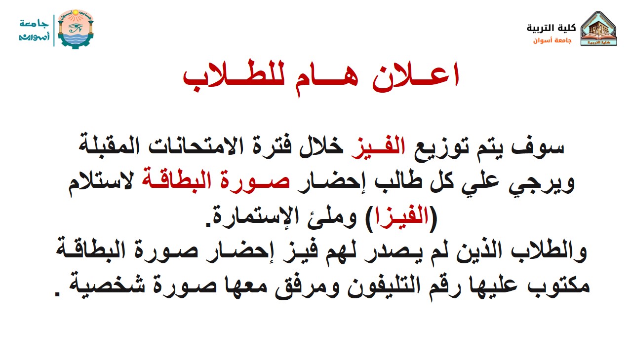 اعـــلان سوف يتم توزيع الفيز خلال فترة الامتحانات المقبلة ويرجي علي كل طالب إحضار صورة البطاقة لاستلام (الفيزا) وملئ الإستمارة .