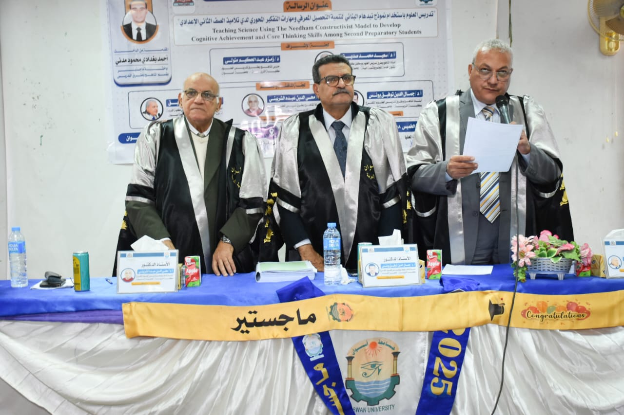 أ.د/ جمال الدين توفيق يونس ـ أستاذ المناهج وطرق تدريس العلوم – وكيل الكلية لشئون خدمة المجتمع وتنمية البيئة – كلية التربية – جامعة أسوان ـ رئيسا ومناقشا.
