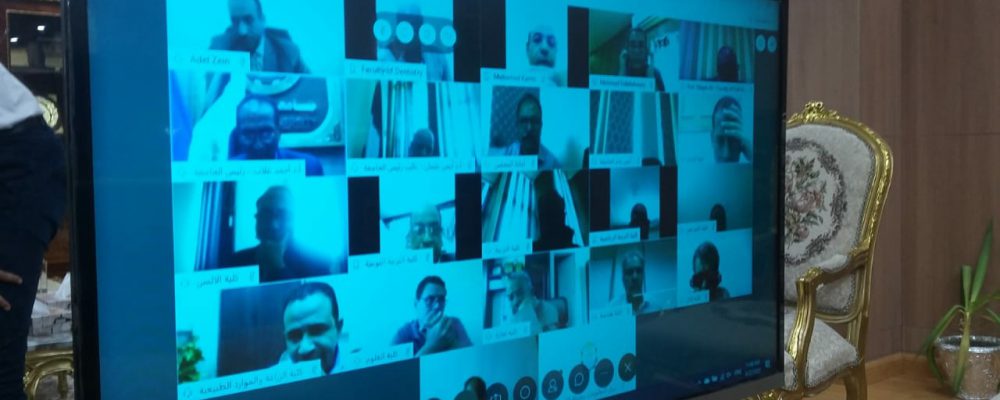 من خلال تقنية شبكة الإنترنت اون لاين مع عمداء الكليات بكلياتهم لمناقشة ضوابط إجراءات إختبارات الفصل الدراسي الثاني 2020