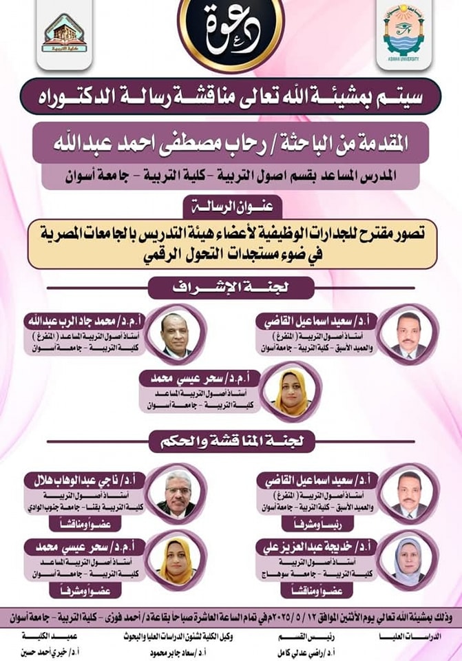 دعوة لحضور مناقشة رسالة الدكتوراة للباحثة / رحاب مصطفي أحمد – قسم أصول التربية