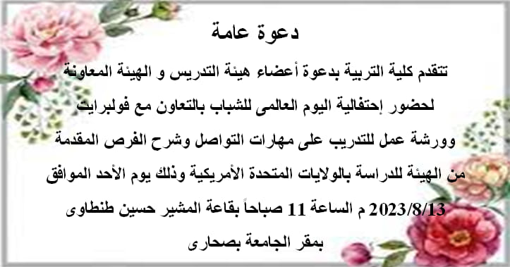 نتيجة الفرقة الأولى أساسى (علمى – أدبى – طفولة)August 20, 2023اقرأ المزيدإعلان هامAugust 17, 2023اقرأ المزيدنتيجة الفرقة الثالثة عام (جميع الأقسام )August 15, 2023اقرأ المزيداحتفالية اليوم العالمي للشبابAugust 13, 2023اقرأ المزيدنتيجة الفرقة الأولى عام (جميع الأقسام )August 8, 2023اقرأ المزيددورة تدريبية بعنوان (دور الشباب التطوعي في المبادرات وتفعيله داخل المجتمع)August 8, 2023اقرأ المزيدنتيجة الفرقة الثانيةAugust 7, 2023اقرأ المزيدتهنئةAugust 6, 2023اقرأ المزيدإعلان هامAugust 5, 2023اقرأ المزيد«‹434445464748495051›»