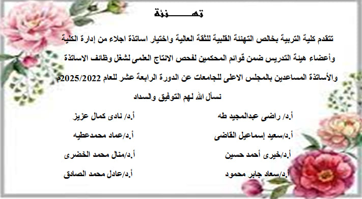 تهنئـــــــــــــــــــــــــــــةNovember 9, 2022اقرأ المزيدإعلان هام للإستفادة من إمكانيات برمجيات مايكروسوفتNovember 6, 2022اقرأ المزيدجدول محاضرات الدراسات العليا للعام الجامعي 2022/2023November 5, 2022اقرأ المزيدمحاضرة بعنوان (الأخطاء الشائعة في مناهج البحث في البحوث التربوية)November 5, 2022اقرأ المزيدإعلان من إدارة النشاط الثقافي الفنيNovember 3, 2022اقرأ المزيدمناقشة رساله الدكتوراه للباحث/ عزالدين على عبدالمنعمNovember 3, 2022اقرأ المزيدنتيجة الدور الثاني (أكتوبر)طلاب دراسات عليا للعام الجامعي 2021/2022مNovember 3, 2022اقرأ المزيدتهنئةOctober 30, 2022اقرأ المزيددعوة محاضرة بعنوان(الأخطاء الشائعة في مناهج البحث في البحوث التربوية)October 30, 2022اقرأ المزيد«‹636465666768697071›»