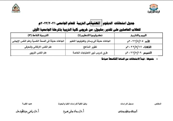 جدول امتحانات الدراسات العلياMay 19, 2022اقرأ المزيدمجلس الكلية _ جامعة أسوان رقم (٣١٣)May 17, 2022اقرأ المزيدمناقشة رساله الدكتوراهMay 15, 2022اقرأ المزيدجدول امتحانات الدبلوم المهنية في التربيةMay 12, 2022اقرأ المزيدمناقشة رساله الماجستيرMay 11, 2022اقرأ المزيدرئيس جامعة أسوان ينعى شهداء الوطن ويقدم العزاء لأسر الشهداء وقواتنا المسلحةMay 8, 2022اقرأ المزيدعزاء واجبMay 6, 2022اقرأ المزيدرئيس جامعة أسوان: يهنئ الرئيس السيسي والشعب المصري بعيد الفطر المباركMay 1, 2022اقرأ المزيدرئيس جامعة أسوان يستقبل لجنة قطاع الآداب بالمجلس الأعلى للجامعاتApril 21, 2022اقرأ المزيد«‹757677787980818283›»