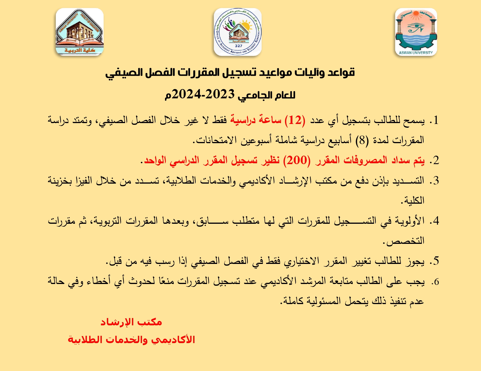 قواعد وآليات مواعيد تسجيل المقررات الفصل الصيفي للعام الجامعي 2023/2024