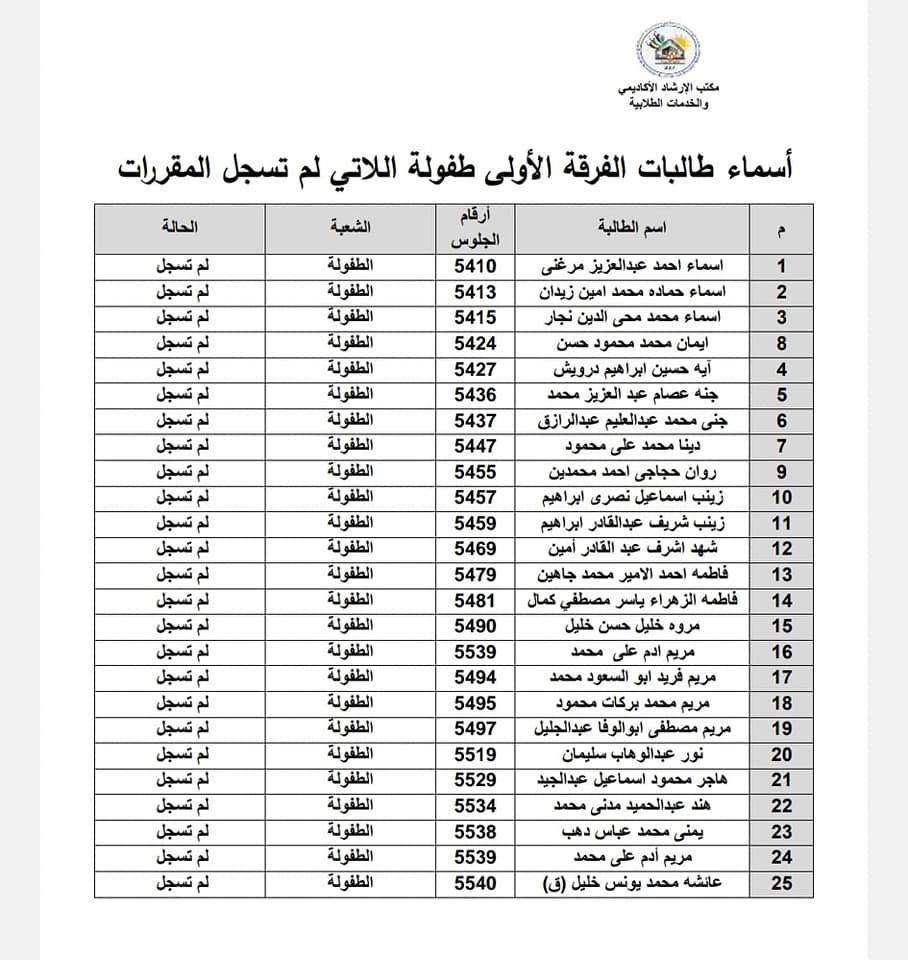 سيتم حذف أسماء الطلاب غير المسجلين للمقررات من القوائم في حالة عدم التسجيل، للإطلاع على الكشوفات يرجى الدخول على: